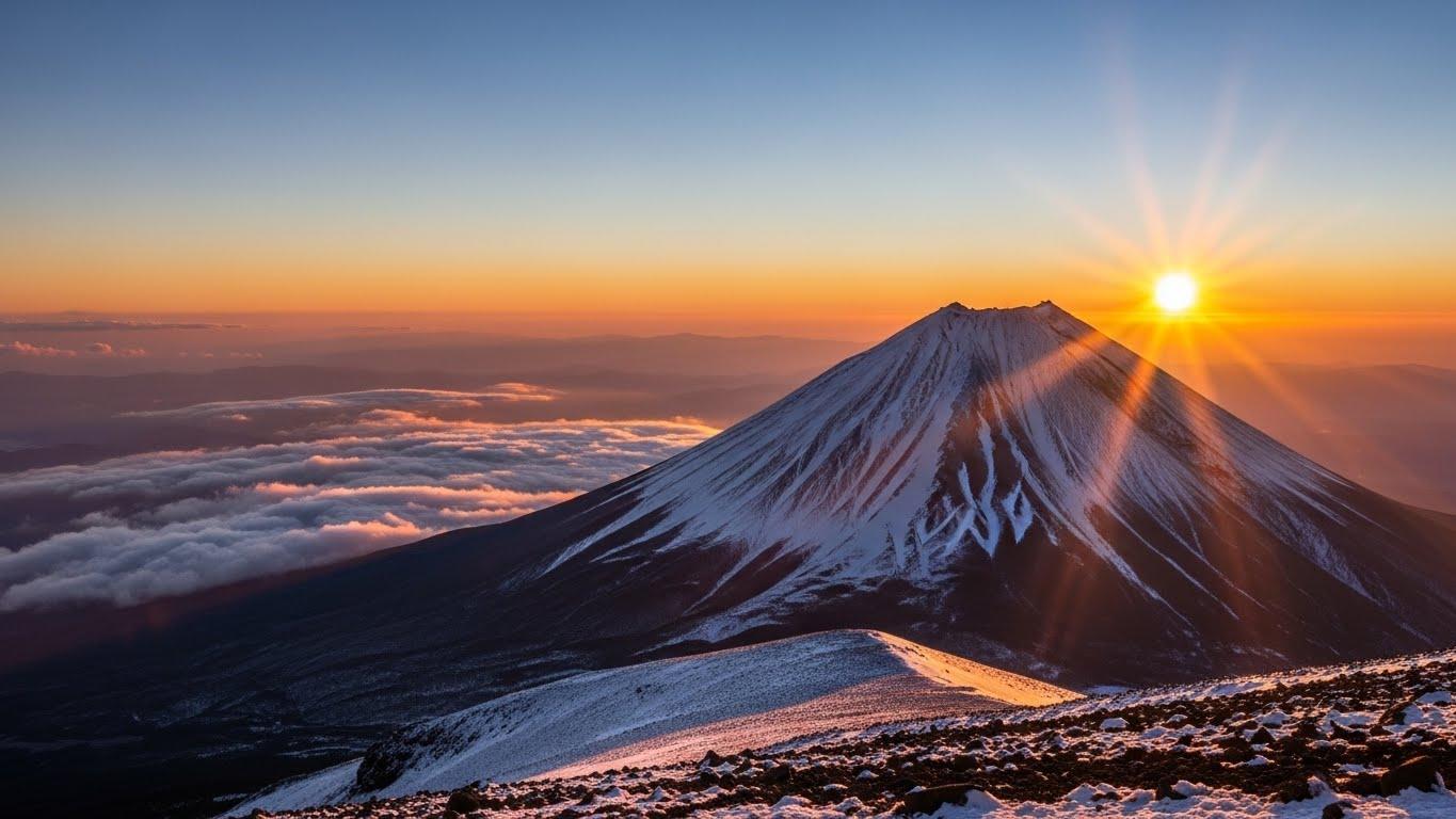 GoogleのImageFXに「日本の初日の出」と入力したら、↓が出力されました。ぱっと見きれいですが、富士山をこんな高い場所から見える地点はないし、雲が富士山まで掛かっていないのは不自然😅