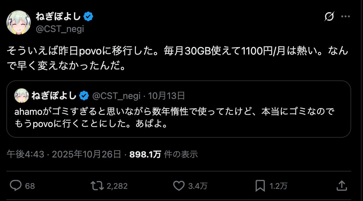povoがどこでも繋がりやすいというわけではないですが、ahamoで電波が悪い人は、さっさとpovoに乗り換えたほうが良いですよー。7割くらいの可能性で改善する気がします。