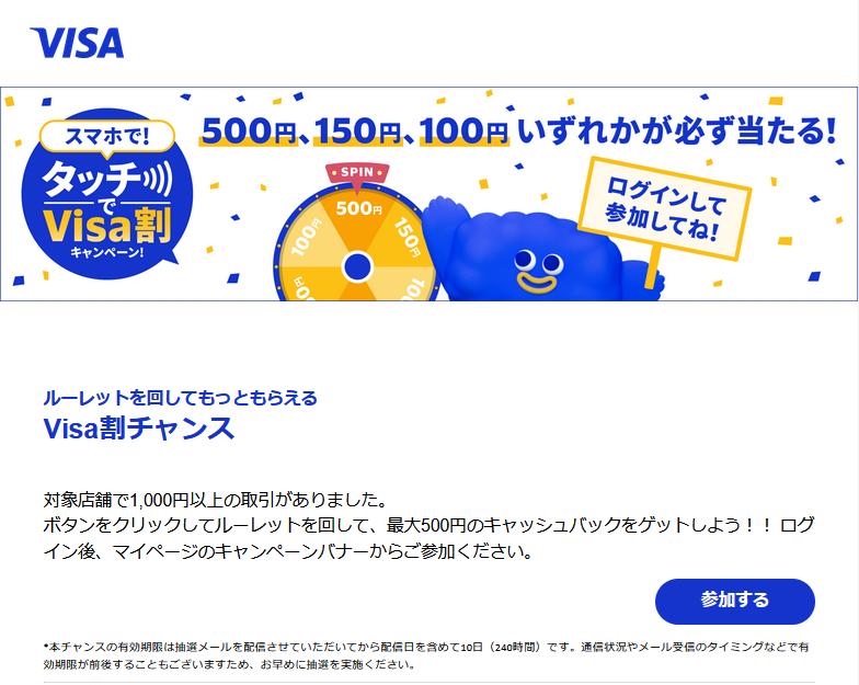 ちなみにメールの「参加する」アイコンを押さなくても、直接でVisa割サイトにアクセスしても抽選ルーレットを回せました。