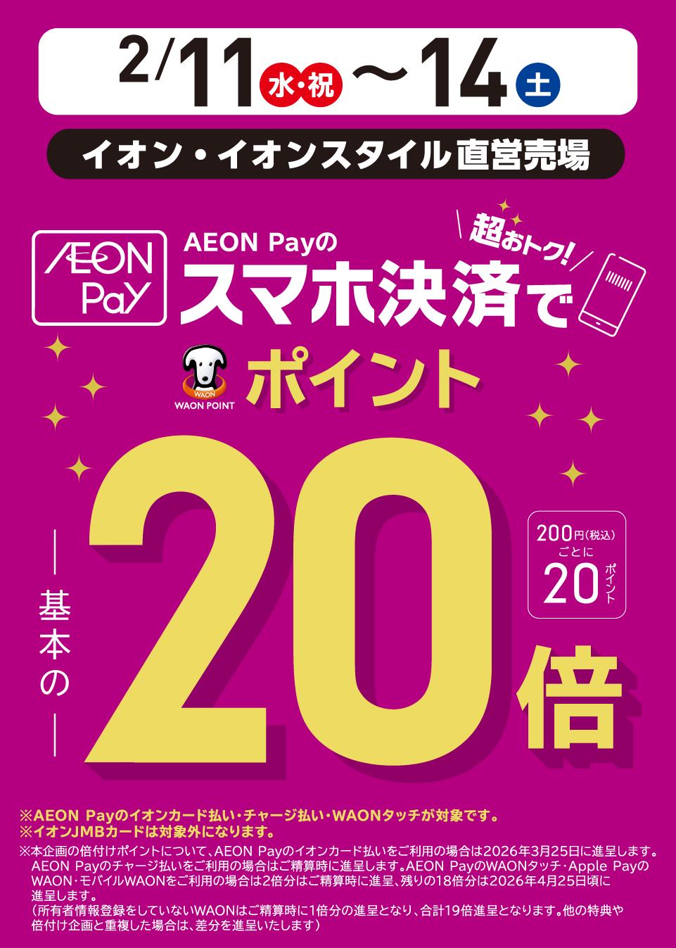 本日2月11日から14日まで、東北を除く本州と、四国のイオン直営売場で、AEON Payスマホ決済で10%還元(200円ごとに20ポイント還元)です。