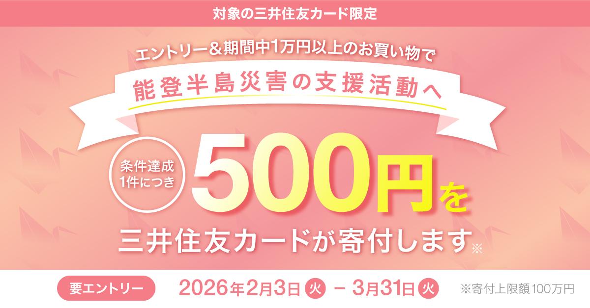 キャンペーン期間中にエントリー&合計1万円(税込)以上のご利用ごとに、能登半島災害の支援活動へ500円を三井住友カードが寄付します。