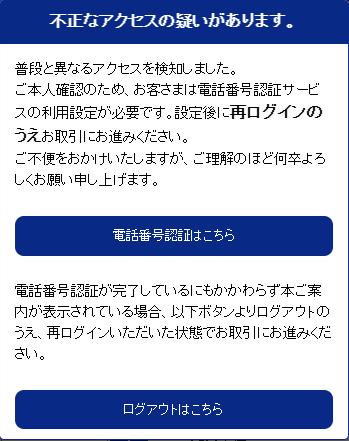 これにより、電話認証しろとの内容は無くなったが、「不正なアクセスが疑われます」と警告が出てその先に進みません。