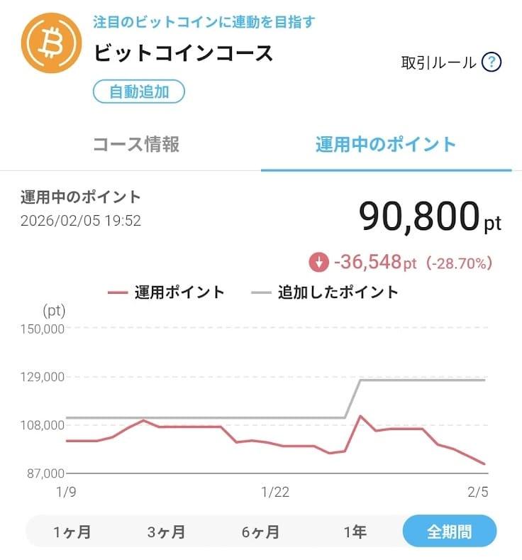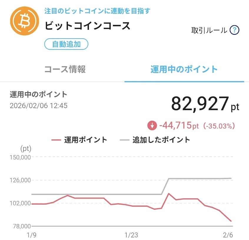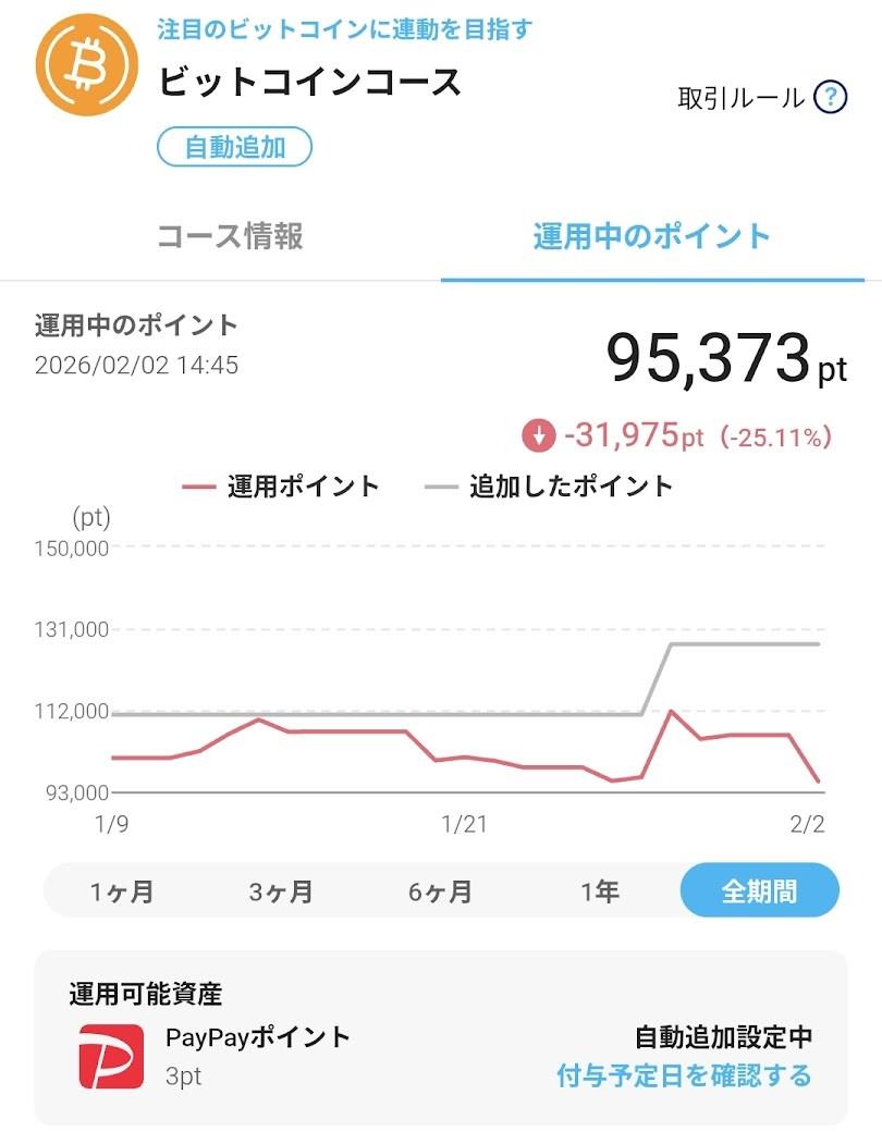 私のPayPayポイント投資のビットコインがさらに下がる・・💀