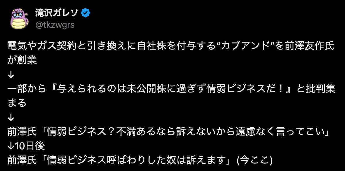 代理店ビジネスで通常料金よりも多少は割安に仕入れられるので、|利益| > |損失|になるかもですが、カブアンドの利益の大半は持分比率が過半数の前澤さんに流れる。