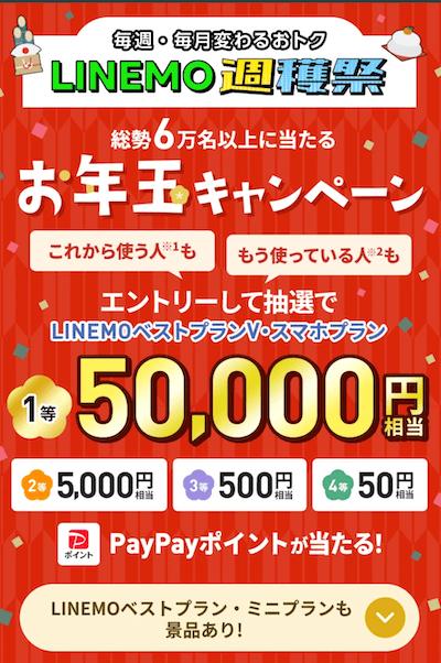 | 公式でLINEMOベストプランV | 乗換:PayPay12,000円 新規:PayPay6,000円 さらに不定期にPayPay最大8,000円増額 |