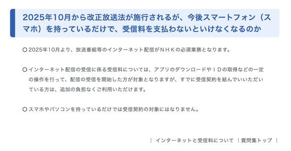 >今後、スマートフォンやPCを持っているだけで、受信料を支払わなければならなくなるのか──。この点についてNHKは、インターネット配信の受信にかかわる受信料について、「アプリのダウンロードやIDの取得などの一定の操作を行って、配信の受信を開始した方が対象となりますが、すでに受信契約を結んでいいただいている方は、追加の負担なくご利用いただけます」としている。