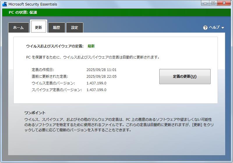 更新切れて5年半以上になりますが、まだMicrosoft Security Essentialsの更新が受け取れますので、そのままサブで使い続けています。
