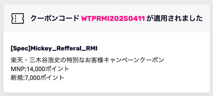 三木谷特別キャンペーンページから申し込むとクーポンが自動的に適用されて、最大14,000ポイントもらえます。楽天リンクの利用も不要です。