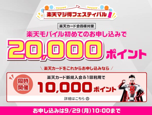 楽天カードを持っていない人で、初めて楽天モバイルと楽天カードを申し込む人が対象のキャンペーンです。楽天カードを持っている人だと20,000ポイントに減額です。