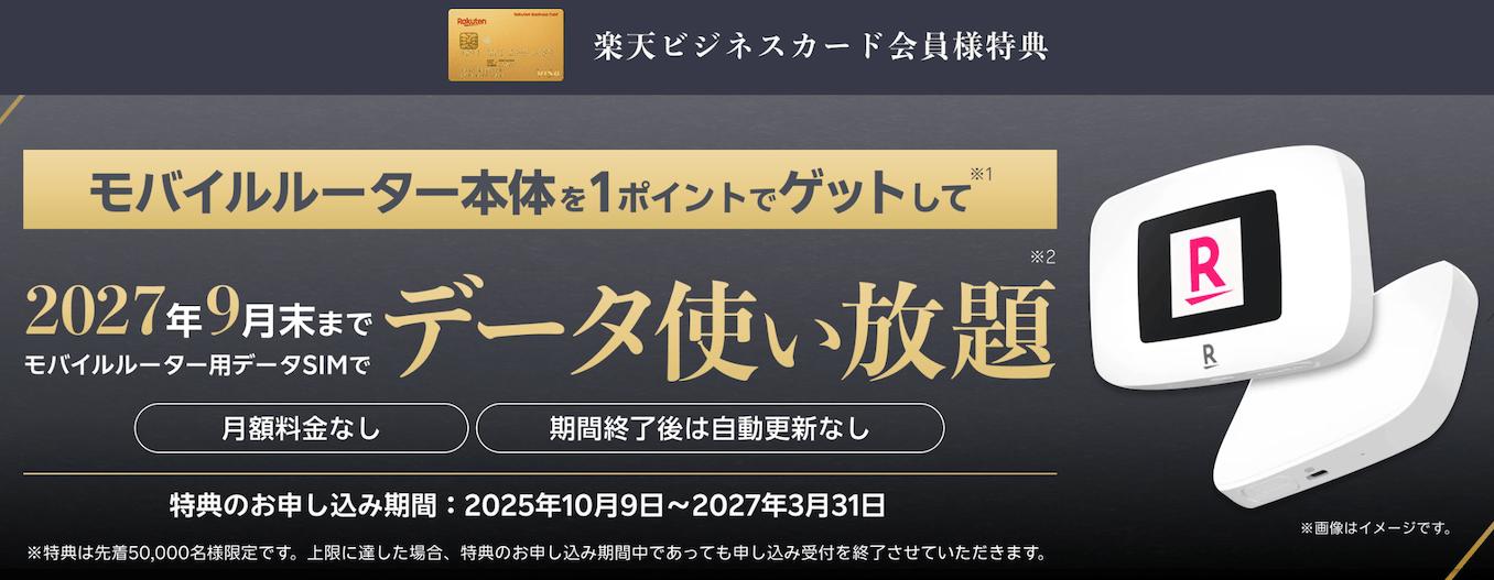 楽天ビジネスカード会員なら1ポイントで楽天モバイルのデータ無制限が無料で使えます。(2027年9月まで)
