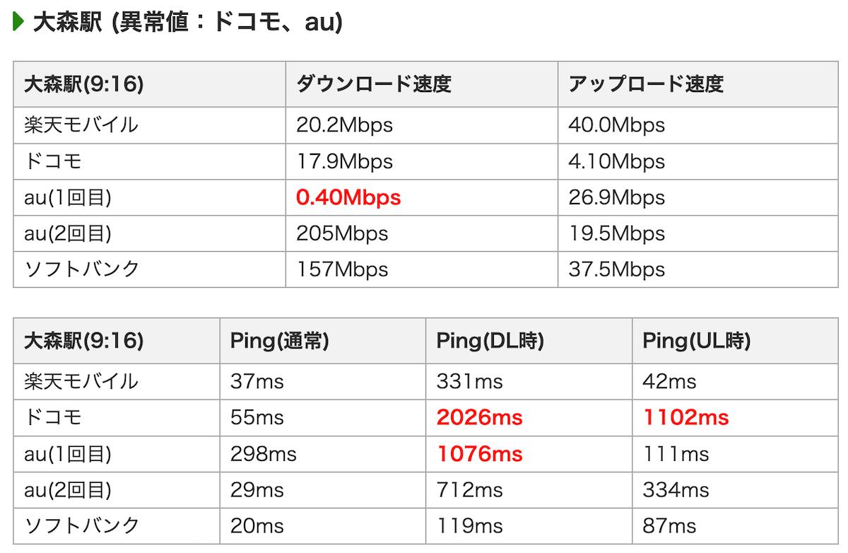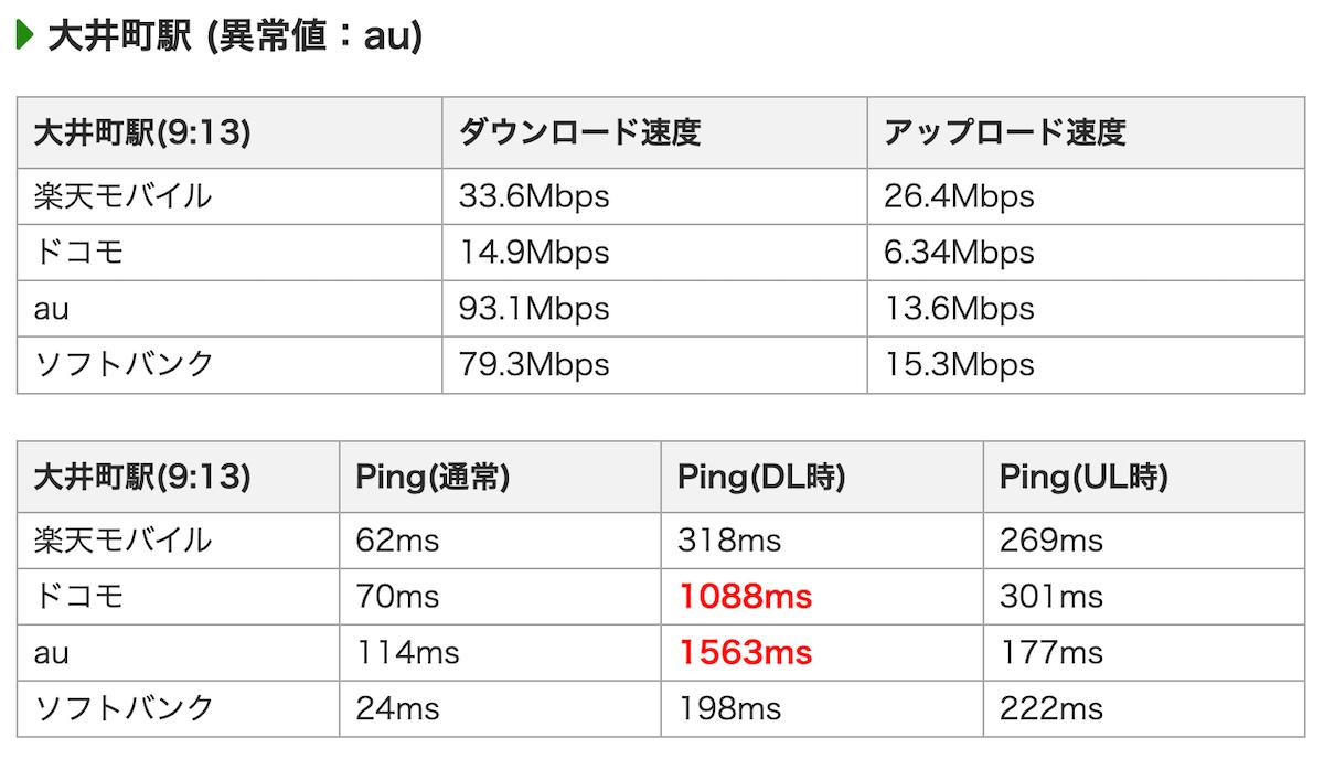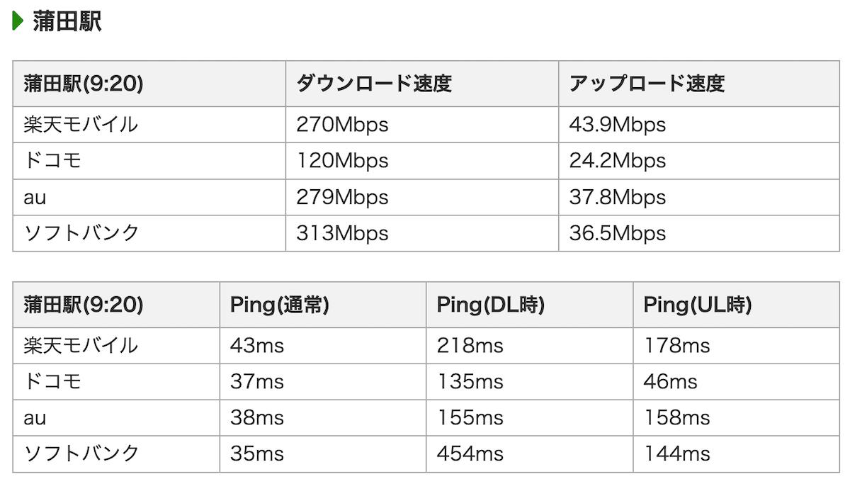 蒲田駅は楽天モバイルとソフトバンクの通信品質が良いです。ドコモとauは通信品質とPingは良いですが、パケットロスがドコモ55.5%、au33.3%もあったので3位です。