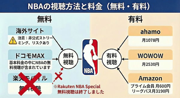 NBAを無料で見る方法【海外サイト/ドコモMAX/ahamo/楽天モバイル/Amazon/WOWOW】