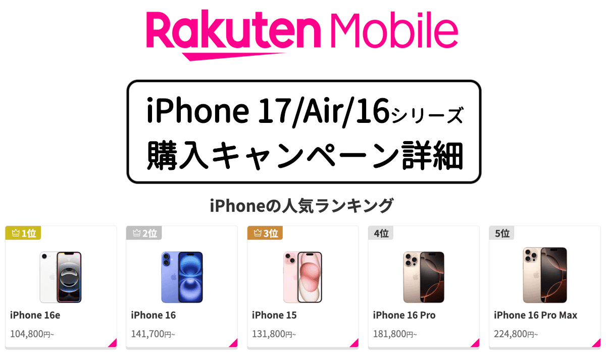楽天モバイルを初めて契約するときにiPhoneをセットに購入すると、キャンペーンでiPhone 16eは最大40,000円相当、iPhone17シリーズとAirは最大21,000円お得に買えます。 iPhone 16eな … 続きを読む 楽天モバイルでiPhoneを買う!17/Air/16シリーズの違いとキャンペーン詳細【16eが月1円で使える】