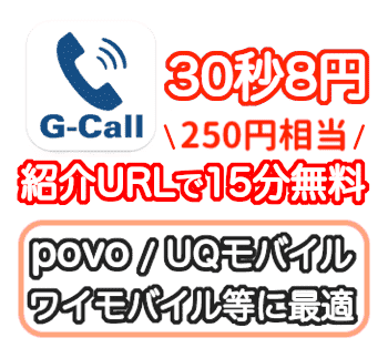 【GCall紹介URLあり】G-Call電話紹介キャンペーンで15分の無料通話、povo/UQモバイル/ワイモバイル/irumoに最適