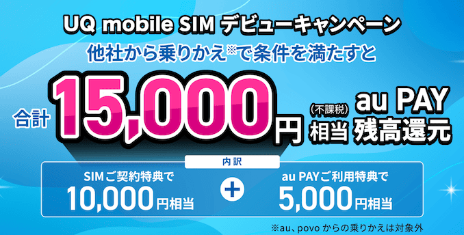 | SIM/eSIMキャンペーン | 乗り換えは最大20,000円相当のau PAY残高 (過去にUQモバイル契約でau PAY残高をもらったことがある場合は対象外になる可能性あり) |