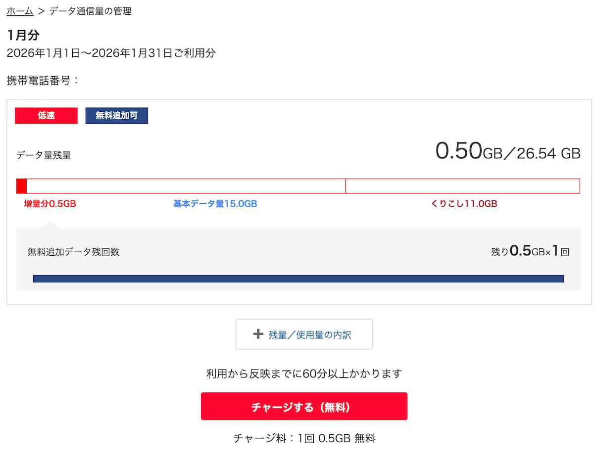 ワイモバイルのパケットマイレージで1回0.5GBのチャージが無料になってました。いつの間にかブロンズランクになってた。